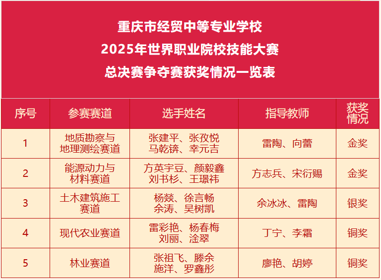 2025年世界職業(yè)院校技能大賽總決賽爭(zhēng)奪賽近日落下帷幕。在學(xué)校領(lǐng)導(dǎo)的高度重視、指導(dǎo)老師的辛勤付出和參賽學(xué)生的出色發(fā)揮下,我校代表隊(duì)經(jīng)過(guò)激烈角逐,最終獲得2金1銀2銅的優(yōu)異成績(jī),并在地質(zhì)勘察與地理測(cè)繪賽道中強(qiáng)勢(shì)闖入世界職業(yè)院校技能大賽排位賽!
